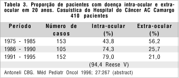 A proporção de pacientes com doença intra-ocular e extra-ocular foi a mesma nos dois períodos da análise (1986 a 1990 e 1991 a 1995). Para pacientes com doença intra-ocular, a porcentagem de casos no primeiro período foi de 74,3% vs. 79% no segundo. Para pacientes com doença extra-ocular, a porcentagem foi de 25,7% no primeiro período vs 21%, no segundo período da análise. Quando comparamos estes dados com os de 158 pacientes analisados anteriormente, no período de 1975 a 1985(16), onde 56,2% eram portadores de doença intra-ocular e 43,8%, de retinoblastoma extra-ocular, pudemos observar que houve uma redução no número de pacientes com doença avançada nos últimos vinte anos (Tabela. 3).