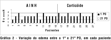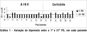 Contudo, analisando-se os dados relacionados à hiperemia, 5/15 (33,3%) pacientes do grupo tratado com AINH apresentaram ++/4 de hiperemia no 21º dia pós-operatório, tendo havido apenas 1 caso (8,3%) no grupo com esteróide. Também se observou, entre os pacientes que usaram AINH, 3 casos de granuloma (20%), ocorridos no lado em que foi feita a ressecção, não tendo sido encontrado nenhum no grupo tratado com corticóide.