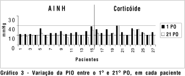 Considerando-se o conforto, edema e PIO, não se observou diferença importante entre os dois grupos. A média de PIO no 21º dia de pós-operatório, no grupo tratado com AINH foi de 10,06, contra 11,54 do grupo com corticóide e, comparando-se a diferença de pressão do olho operado com o não operado, a variação foi de 0,66 para o grupo com AINH, contra 0,75 para o com corticóide. Se fosse considerado 1 ponto para cada cruz de hiperemia ou edema no 21º PO, o grupo com AINH teria média 1,20 na hiperemia (contra 1,08 do grupo com corticóide) e 0,2 para edema, contra 0,08 no grupo usando corticóide. Em relação ao conforto, a nota média no 21º PO no grupo com AINH foi 9,26 e no com corticóide 9,70. Observando-se estes dados vê-se que, quanto ao conforto, edema e hiperemia os pacientes com corticóide foram ligeiramente melhores, o inverso se dando em relação a PIO; no entanto, em nenhum dos casos a diferença entre os dois grupos foi expressiva.