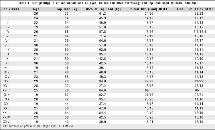 The average load among the volunteers was 56.96 kg, ranging from to 84.0 kg, with a standard deviation of 14.19 kg. The average of 85% of the top load (which is the load defined to perform the work out) was 48.42 kg, with a standard deviation of 12.06 kg. IOP results before and after exercising are listed in Table1. In some eyes, there was no alteration (LE of individuals IV, X and XII and RE of individual XVIII), neither IOP increase (LE of individuals V, VIII, XVI, and XIX and RE of individuals XVI and XIX) after exercising.