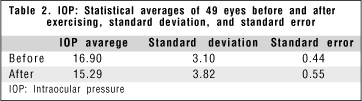 According to this table, one can see that IOP after exercising was decreased by 1.61 mmHg and this decrease was statistically significant according to the paired t test, as shown in Table 3.