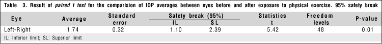 Data were those of the two eyes of 24 volunteers, and only the right eye of individual XVIII was not measured, totalizing 49 eyes, for there were no statistical differences between LE and RE IOP averages both before and after exercising (Table 2).