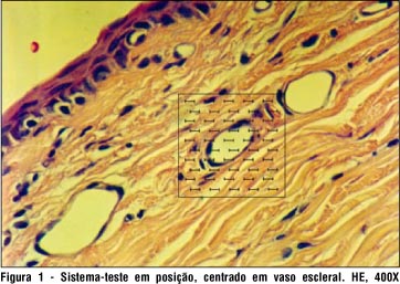 Para o estudo morfométrico, empregou-se um sistema-teste com pontos fixos e sistematicamente eqüidistantes. Sob microscopia óptica em aumento de 400 vezes, contou-se o número de campos não-coincidentes da esclera pelo retículo do sistema-teste, colocando-se este último em vários sentidos (horizontal, vertical e oblíquo) dentro da área de estudo. Estas medidas permitiram padronizar o local para a avaliação dos vasos. Foram avaliados de cinco a dez campos em cada lâmina.