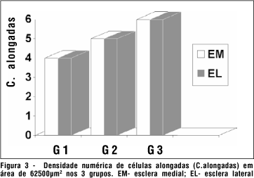 5. Em relação aos núcleos de células alongadas, o grupo 3 apresentou maior número em relação aos grupos 1 e 2, tanto na região medial, quanto na região lateral (fig. 3).
