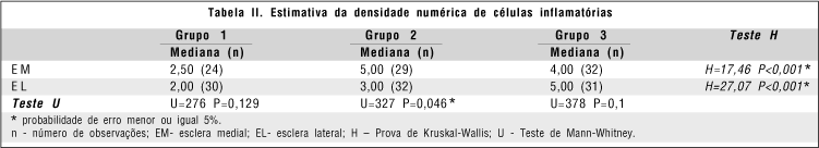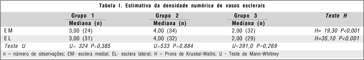 Alguns dos resultados da avaliação morfométrica dos vários parâmetros estudados podem ser observados nas tabelas I e II e nas figuras 2 e 3. As regiões medial (EM) e lateral (EL) da esclera foram comparadas entre si e em relação aos 3 grupos. Os valores mostram as medianas, número de observações(n) e os resultados das Provas de Kruskal-Wallis (H) e Mann-Whitney (U). Os valores apresentados nas figuras 2 e 3 são medianas referentes aos parâmetros avaliados nos 3 grupos.