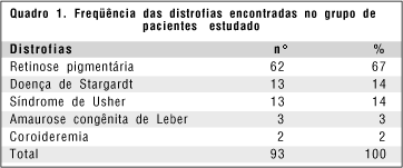 Quanto à divisão por doença dos 93 pacientes argüidos, havia 62 pacientes com retinose pigmentária, 13 com doença de Stargardt, 13 com síndrome de Usher, três com amaurose congênita de Leber e dois com coroideremia (quadro 1).