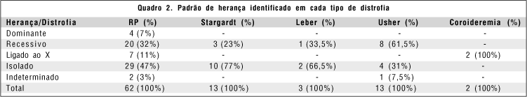 Dos pacientes com retinose pigmentária (RP), o padrão de herança detectado foi autossômico dominante em quatro casos, autossômico recessivo em vinte casos, ligado ao cromossomo X recessivo em sete casos, caso isolado em vinte e nove e padrão indeterminado em dois (quadro 2). Para a doença de Stargardt três indivíduos seguiam o padrão de herança autossômico recessivo e dez eram casos isolados. Dos treze pacientes com síndrome de Usher, oito apresentavam herança autossômica recessiva, quatro eram casos isolados e um tinha o padrão de herança indeterminado. Os dois pacientes com coroideremia seguiam o padrão de herança ligado ao X recessivo. Para amaurose congênita de Leber, um paciente tinha padrão autossômico recessivo de herança e dois eram casos isolados (quadro 2).