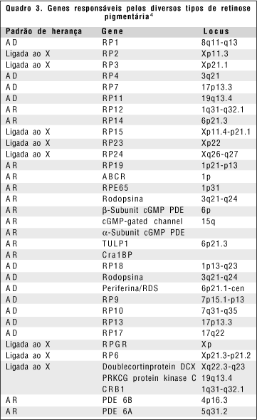 O padrão de herança da retinose pigmentária pode ser caso isolado, autossômico dominante, autossômico recessivo, ligado ao X recessivo(11). Quanto aos genes responsáveis pela retinose pigmentária, uma grande quantidade já foi identificada(4) (quadro 3).