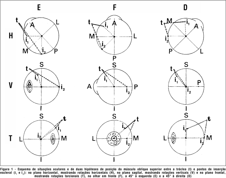 As duas circunstâncias esquematizadas na figura 1 ilustram como nem sempre o aparentemente melhor numa transposição muscular torna-se a opção mais favorável para o alcance de um certo objetivo. Por exemplo, i1 é a posição da inserção do oblíquo superior tal que suas ações verticais e torcionais no olhar em frente fiquem nulas, sobrando apenas a de adução. Apesar dessa ação horizontal ser favorecida em abdução, aparece um discretíssimo componente rotacional para sursundução e um para inciclodução. Mas todas essas ações se invertem em adução (passam a abdução, deorsundução e exciclodução). De qualquer modo, a ação horizontal aparentemente favorecida pela escolha de uma posição de inserção ocular do músculo em que seus efeitos vertical e torcional estariam abolidos é de resistência ao movimento executado (efeito adutor em abdução e abdutor em adução). Aliás, mesmo em posição primária do olhar a ação remanescente é pequena, predominando efeitos translacionais (2). Já a reinserção do músculo em i2 mantém o músculo sempre abdutor, abaixador (invertendo-se para elevador apenas em abduções superiores a 45º) e exciclodutor (invertendo-se a inciclodutor apenas em aduções acima de 45º).