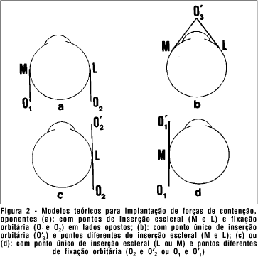 O aumento de forças passivas, por contenções elásticas, para impedir o movimento ocular em um certo sentido (por exemplo, para a direita, em nistagmos de sacudida para a direita) determinariam, igualmente, uma rotação ocular em sentido oposto (para a esquerda) produzindo, binocularmente, um desvio conjugado. Para evitar isso, outras forças, de igual magnitude, mas de sentido contrário, deveriam igualmente ser incluídas no sistema oculomotor (figura 2). Lembre-se que inserções orbitárias anteriores (como O´2 na figura 2c; O´1 na 2d e O´3 na 2b) são possíveis, em rebordas orbitárias superior e inferior(12), as chamadas "trações reversas".