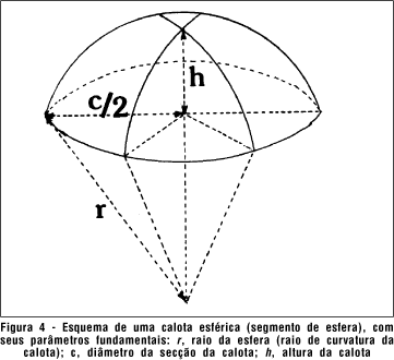 A superfície de contato desse material viscoelástico, isto é, da bolsa que o contém, ajustada à do olho, pode ser determinada por elementos da Geometria. Sabe-se que a área superficial de um olho (4p r2) com r = 1,22 cm é 18,704 cm2 e o volume (= 4 pr3/3) é 7,606 cm3. Assim, a área (A) de um segmento esférico (figura 4) é A = 2 p r h, onde r = (c2 + 4h 2)/8h. Portanto A = (c2 + 4h 2) p/4; e o volume (V) é: V = p h2 (r - h /3) = p h (3c2 + 4h2)/24. Por exemplo, para uma área de contato A = 2,3 cm2 e r = 12,2 mm (raio de curvatura de um globo ocular de tamanho padrão), vem h = 3 mm e c ~ 16 mm.