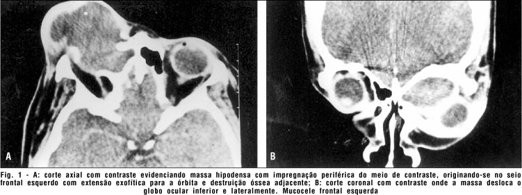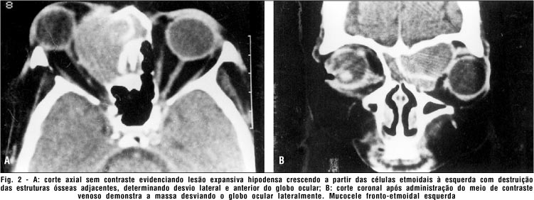 À tomografia computadorizada, apresenta-se em geral como lesão cística de conteúdo líquido, de baixa densidade (10 a 18 u.H.) e homogênea. Sua expansão gera remodelamento do tecido ósseo adjacente, com afinamento ósseo e perda deste tecido por provável isquemia secundária à compressão crônica do periósteo. Desta forma, a mucocele "invade" a cavidade orbitária, causando proptose e deslocamento das estruturas adjacentes(6-7,10) (Fig. 1). Em alguns casos também se observa esclerose óssea. É importante lembrar que a mucocele não causa destruição óssea grosseira, o que ajuda a diferenciá-la dos carcinomas do seio da face e das lesões metastáticas, importantes diagnósticos diferenciais nas lesões das cavidades paranasais.