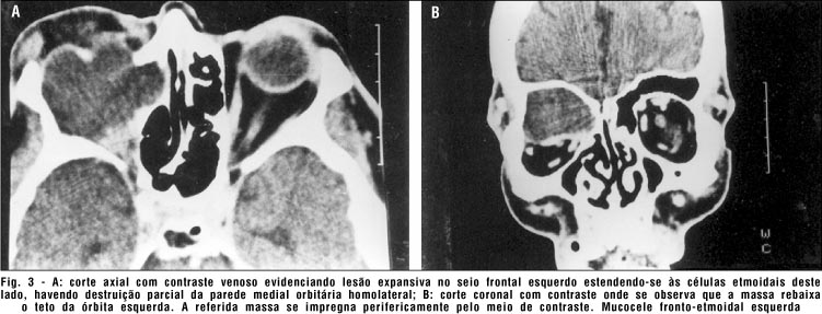 À tomografia computadorizada, encontramos massa com destruição óssea adjacente e desvio do globo ocular, dependendo da localização da mucocele (Fig. 3). É importante lembrar que a mucocele não causa destruição óssea grosseira, o que ajuda a diferenciá-la dos carcinomas dos seios da face e de lesões metastáticas. Outros achados descritos na literatura são o remodelamento ósseo (com afinamento e perda de tecido por isquemia secundária à compressão crônica do periósteo) e a esclerose óssea, que puderam ser observados neste estudo.