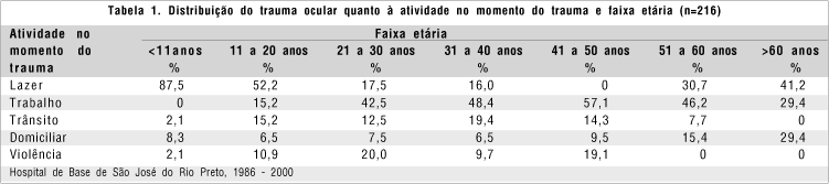 Quanto à atividade no momento do trauma, verificou-se que 88 (40,7%) pacientes encontravam-se em atividades de lazer; 62 (28,7%) no trabalho; 23 (10,6%) no trânsito; 21 (9,7%) em ambiente doméstico e 21 (9,7%) em decorrência de violência. O resultado dos traumas oculares em relação à atividade no momento do trauma e faixa etária está disposto na tabela 1.