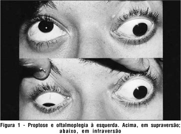 Quanto à proptose manifestada pela paciente, trata-se de uma das manifestações mais incomuns dos adenomas hipofisários. Dois são os mecanismos responsáveis por tal manifestação. O primeiro mecanismo é decorrente da oftalmoplegia, que produz um certo grau de proptose devido ao relaxamento do tônus muscular. É difícil definir com exatidão a quantidade de proptose causada por tal mecanismo. Alguns autores referem que a oftalmoplegia poderia levar a 1 a 2 mm de proptose(9), enquanto que Acers(10) relatou um paciente que apresentava 3 mm de proptose decorrente de oftalmoplegia completa e que mostrou regressão completa após a recuperação do tônus motor. O segundo mecanismo, responsável pela proptose é mesmo a invasão orbitária acometendo o ápice da órbita e a fissura orbitária superior. Uma vez que o componente do tumor que invadia a órbita não era muito grande no caso em estudo, acreditamos que este não seria suficiente para explicar a magnitude da proptose (6 mm). O mais provável, portanto, é que tenha havido uma combinação de fatores sendo a oftalmoplegia completa responsável por parte da proptose (2 a 3 mm) e a invasão orbitária pelo restante. Por outro lado deve ser lembrado que embora a invasão orbitária não tenha sido tão grande, esta acometia o ápice da órbita na região do canal óptico e da fissura orbitária superior, região na qual, invasões orbitárias têm, proporcionalmente, maior repercussão no deslocamento anterior do globo ocular.