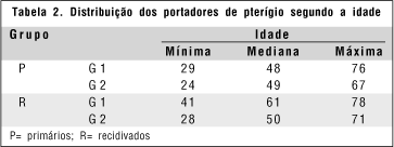 Com relação à idade, dentre os pterígios primários, a mediana foi de 48 anos no G1 e 49 no G2; dentre os recidivados, 61 anos para o G1 e 50 para o G2 (Tabela 2).
