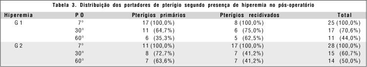 A hiperemia conjuntival ocorreu em todos os pacientes no 7º PO, persistindo em alguns portadores de pterígios primários, assim como de recidivados, até o 60º PO, tanto em G1, como em G2. (Tabela 3)