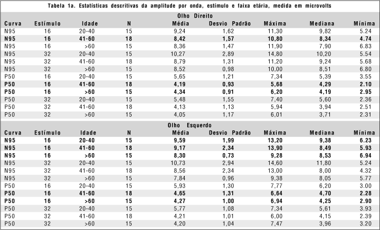 Compararam-se as variáveis (amplitude, latência e duração) entre os sexos, idades e estímulos utilizados para cada tipo de onda (N95 e P50), através da análise de variância (ANOVA) com medidas repetidas para experimento fatorial(14). Os fatores utilizados foram o sexo (masculino ou feminino), a idade (20 a 40 anos, 41 a 60 anos ou maior que 60 anos) e o estímulo (16 e 32). Os olhos direito e esquerdo foram usados como medida repetida, devido às medidas serem feitas no mesmo paciente.