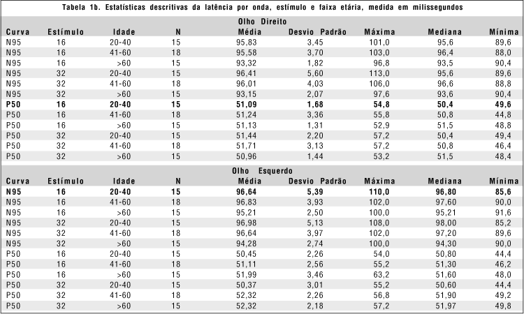 Para os padrões de estímulo 16 e 32, obteve-se em cada variável (latência, amplitude e duração total das curvas P50 e N95), uma faixa de normalidade, considerando a média ± dois desvios padrões, separando-se o olho direito do esquerdo, a curva, o estímulo e a faixa etária (Tabelas 1a, b e c, respectivamente).