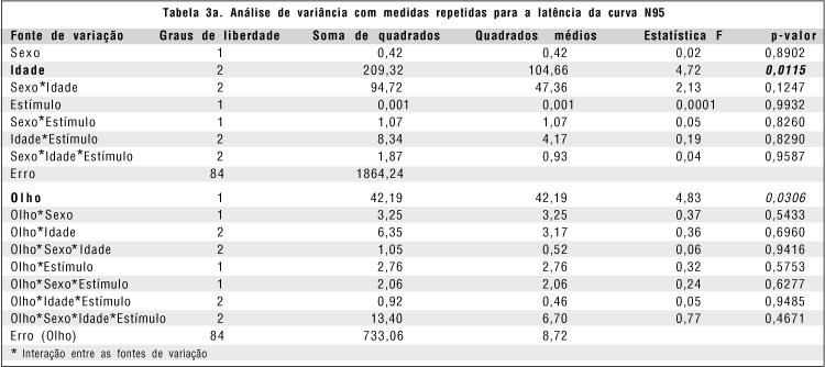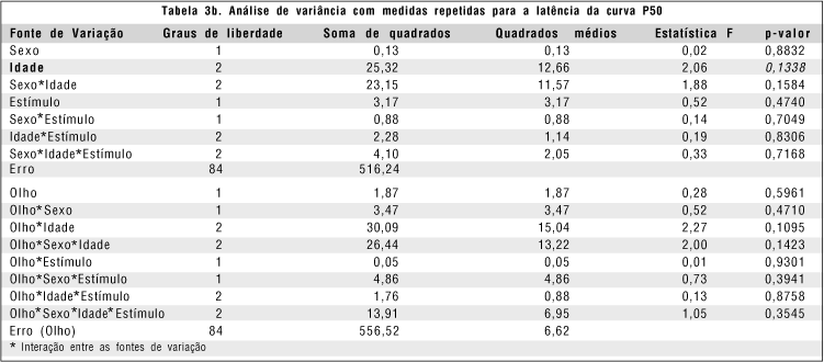 Pela análise de variância para a latência da onda N95 (Tabela 3a), verifica-se que houve diferença significativa entre as idades (p=0,0115) e entre os olhos (p=0,0306), mas não entre os estímulos utilizados. Para a latência da onda P50 (Tabela 3b) não houve nenhum efeito significativo.