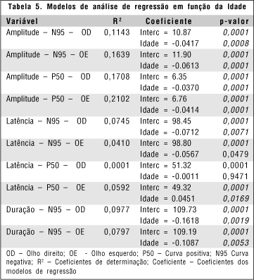 Utilizou-se o coeficiente de correlação linear de Pearson(14) para verificar a relação entre a variável idade e as variáveis resposta (amplitude, latência e duração).