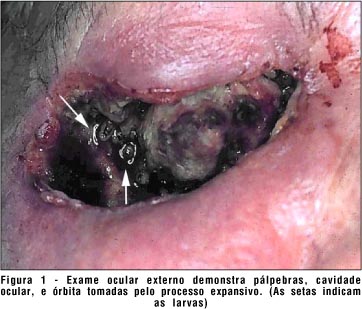 Na avaliação inicial, observou-se área de necrose em órbita direita, envolvendo a pálpebra superior e inferior, globo ocular e demais estruturas intra-orbitárias rodeadas por área de hiperemia, hemorragia moderada e número abundante de larvas invadindo toda a área necrótica (Fig.1).