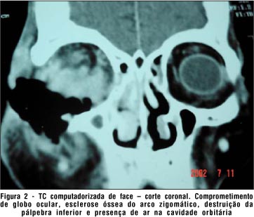 A tomografia computadorizada de crânio e órbitas mostrou extensa lesão ulcerada, profunda, localizada no assoalho orbitário direito, com acentuado acometimento das estruturas intra-orbitárias adjacentes; importante destruição do globo ocular; esclerose óssea do arco zigomático; espessamento mucoso do seio maxilar, células etmoidais, fossas nasais e conchas nasais à direita. Havia solução de continuidade na lâmina papirácea direita. Não havia sinais de extensão intracraniana (Fig. 2 e 3).
