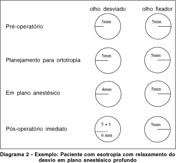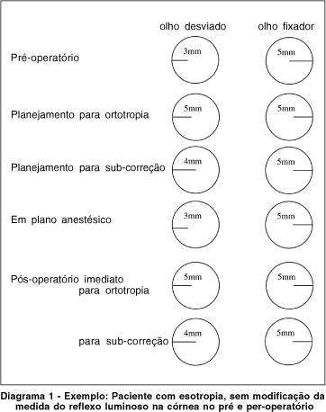 1) Não haver modificação do desvio em plano anestésico. Nesta situação, se o que se planeja é ortotropia, por exemplo, ao final da cirurgia a medida do reflexo no olho antes desviado deve estar na mesma distância do limbo que no olho fixador (Diagrama 1).
