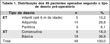 Foi realizada a cirurgia ajustável em 49 pacientes, com idade entre 6 e 55 anos (média= 23 anos e 3 meses ± 12 anos e 3 meses, mediana= 20 anos). Dos 49 pacientes operados, 22 (44,9%) tinham esotropia (ET) e 27 (55,1%) exotropia (XT). Considerando as subclassificações dos desvios, a amostra de 49 pacientes subdivide-se nos tipos de desvio descritos na tabela 1.