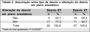 Encontrou-se associação estatisticamente significante entre tipo de desvio e sua alteração em plano anestésico (P=0,0226). Este fato foi de particular evidência entre os portadores de ET. A modificação do ângulo do estrabismo sob anestesia ocorreu em 77,3% das ET e 40,7% das XT. Houve diferença significante entre essas proporções (Tabela 4).