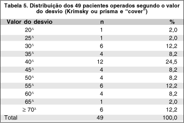 Na tabela 5, encontra-se a distribuição dos valores dos desvios pré-operatórios (Krimsky ou prisma e "cover"). Dos 49 pacientes, 25 (51,0%) apresentavam desvio igual ou maior que 45 DP e 24 (49,0%) tinham desvio até 40 DP.