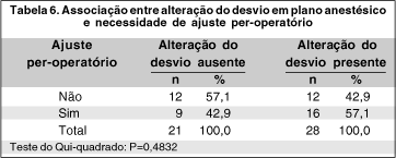 Não foi encontrada associação estatisticamente significante entre alteração do desvio no per-operatório e necessidade de ajuste per-operatório (P= 0,4832) (Tabela 6).