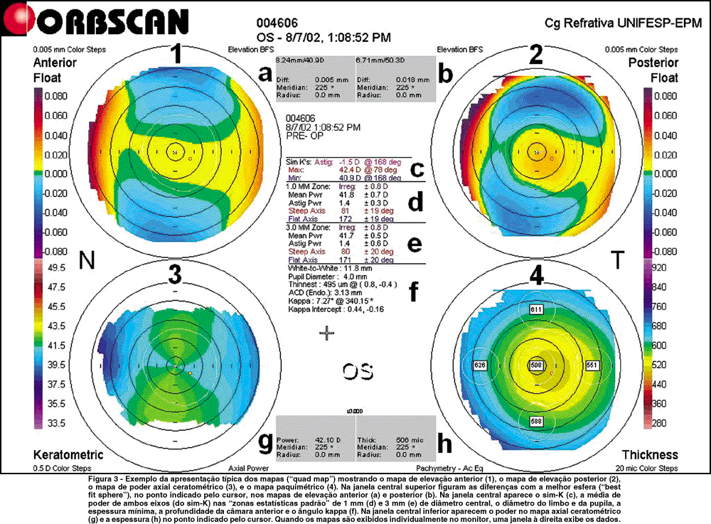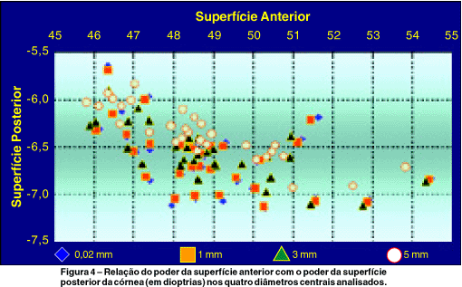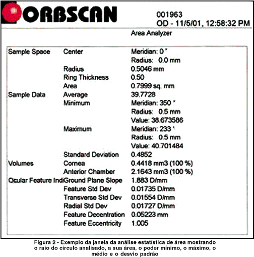 INTRODUÇÃO O poder óptico da córnea (K), em dioptrias, é convencionalmente determinado pela medição do raio de curvatura (r) da sua superfície anterior pela ceratometria manual e, mais recentemente, pela computadorizada e pelo sistema de análise topográfico(1-2). A sua aceitação como um dado válido, se fundamenta na fórmula da "lente fina" (K = n2 - n1 / r), onde n1 é o índice de refração do ar e vale 1, e n2 é o índice de refração ceratométrico (IRC) ou índice de refração corrigido da córnea. Este IRC vale 1,3375(3), embora alguns aparelhos usam também 1,3313 ou 1,336(2-4). O IRC é um valor arbitrariamente assumido a partir do poder óptico (+45 D) e do raio de curvatura anterior (7,5 mm) da córnea no modelo de olho proposto por Gullstrand há mais de 100 anos(3-6) . O IRC pressupõe uma superfície anterior da córnea com um poder 10 vezes maior que o da superfície posterior(7). Para se calcular o poder refrativo real da córnea é preciso considerar que este sistema é composto de duas superfícies ópticas (faces anterior e posterior) separadas por uma distância entre elas (espessura) e de três meios ópticos (ar, córnea e humor aquoso) cada um com um índice de refração diferente (Figura 1). Enquanto que a espessura da córnea pode ser determinada pela paquimetria óptica ou pela ultra-sônica(8), a limitação técnica de medir sua superfície posterior sempre dificultou a confirmação do valor de K, aferido nos equipamentos, como seu poder real(2,4). Por outro lado, pela video-ceratoscopia por varredura de fenda de luz combinada com a reflexão do disco de Plácido, milhares de pontos da córnea e da câmara anterior são localizados tridimensionalmente. O Orbscan-II, (Bausch & Lomb-Orbtek Inc, Salt Lake City, Utah) originalmente lançado como um paquímetro computadorizado, usa diversas metodologias de cálculo para transformar esta informação em mapas topográficos de elevação, de poder ou paquimétricos, entre outros, não só da superfície anterior da córnea, mas também da sua superfície posterior, da sua espessura e da câmara anterior(7,9-12). Os mapas de elevação comparam ambas superfícies da córnea com as suas melhores esferas possíveis, ("best fit sphere"), distribuindo o que estiver desigual, tanto acima (áreas de cores mais quentes) quanto abaixo (áreas de cores mais frias) delas. A diferença de altura é expressa em mm de raio da esfera calculada pelo método do mínimo quadrado ("least square") de uma área, de diâmetro predeterminado, centralizada em um ponto de referencia (o eixo visual, o ápice ou o centro geográfico da córnea). O mapa paquimétrico mostra a diferença em elevação entre as superfícies anterior e posterior da córnea. Como esta medida é 5% a 8% superior à paquimetria ultra-sônica, o Orbscan-II corrige esta informação mostrando o equivalente acústico da espessura da córnea(8-9,13-14). Dependendo do índice de refração usado ou da porção analisada da córnea, os diversos mapas de poder são subdivididos em ceratométrico, anterior, posterior, total e da espessura. Para os mapas de poder ceratométrico, o Orbscan-II usa automaticamente o IRC de 1,3375. Para os mapas de poder anterior, posterior e total da córnea usa a variação fisiológica dos índices de refração do ar (1,0), da córnea (1,376) e do humor aquoso (1,336). O mapa de poder da espessura ("thickness power map") representa a contribuição, no poder total, da espessura da córnea medida perpendicularmente à superfície anterior. Os mapas de poder são também classificados segundo sua forma de cálculo. Os mapas de poder médio ("mean power maps") representam o equivalente esférico, isto é, a média aritmética da curvatura, em dioptrias, de cada ponto nas duas superfícies da córnea, em todas as direções (meridianos). O mapa de poder médio total é a soma dos mapas de poder médio anterior, posterior e da espessura. Os mapas de poder óptico ("optical power maps") são uma representação da capacidade de focalização da córnea e são também denominados de poder refrativo ou de Snell. Os mapas de poder astigmático mostram o astigmatismo ponto por ponto da córnea. Os mapas de poder axial computam os raios de curvatura da superfície da córnea, em planos ou eixos individuais, centralizados na linha de visão. Os mapas de poder tangencial são um melhoramento dos mapas de poder axial e consideram um círculo tangencial a cada ponto analisado. Os mapas de poder óptico total, axial total e tangencial total representam a soma do poder das superfícies anterior e posterior da córnea, desconsiderando a espessura. OBJETIVOS O presente estudo tem por objetivo avaliar o poder da porção central da córnea normal, a partir das medidas fornecidas pela topografia por varredura de fenda de luz e disco de Plácido. Perguntas sobre os melhores parâmetros para uso nas fórmulas de cálculo de poder das lentes intra-oculares (LIOs), mapa a usar, área a analisar, ou valor óptico da espessura da córnea, deverão ser respondidas a partir do alicerce deste trabalho, com o intuito dirigido a resolver a questão de se o Orbscan-II é útil como ferramenta para minimizar os erros refracionais pós-facectomia nos pacientes submetidos a cirurgia refrativa da córnea. MÉTODOS Foi analisada a video-ceratoscopia por varredura de fenda de luz e disco de Plácido com o Orbscan-II de 30 olhos normais, de pacientes diferentes, selecionados pela ordem de arquivo no equipamento. A refração e a lateralidade do olho examinado não foram levadas em conta. Os mapas estudados foram os seguintes: de poder médio ceratométrico, médio anterior, médio posterior, médio da espessura e médio total, de poder óptico ceratométrico e óptico total, de poder axial ceratométrico e axial total, de poder tangencial total e o mapa paquimétrico. Considerou-se a média do poder da córnea e da paquimetria de áreas com 0,04, 1,0, 3,0 e 5,0 mm