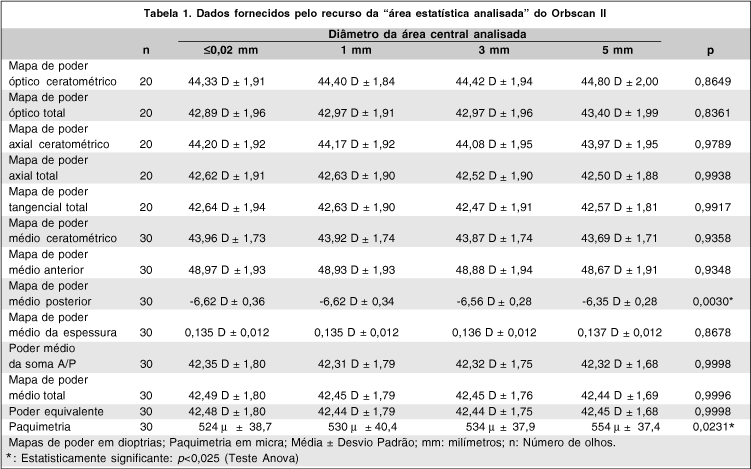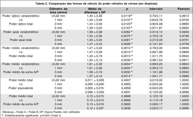 ABSTRACT PURPOSE: To evaluate the dioptric power of the normal central cornea. METHODS: Retrospective analysis of combined slit-scanning and Placido-ring topography in 30 normal eyes. RESULTS: Keratometric-mean, anterior-mean, thickness-mean, and total-mean powers; keratometric-optical and total-optical, keratometric-axial and total-axial, and total-tangential powers; equivalent power and the addition of anterior and posterior mean powers, were similar (p>0.8361) in the four analyzed central areas with 0.04, 1.0, 3.0, and 5.0 mm diameter. The posterior-mean power decreased (p=0.0030) from -6.62 D to -6.35 D. The average thickness increased (p=0.0231) from 524 µm to 554 µm, representing 0.13 D of total-mean corneal power. Keratometric-optical (p<0.0167), keratometric-axial (p<0.0099), and keratometric-mean powers (p<0.0030) were approximately 1.5 D more positive than the respective total powers. Total-mean power was equal to equivalent power (p>0.4907), and to the addition of anterior-mean and posterior-mean powers (p>0.3868). Anterior-mean power was about 7.5 greater than posterior-mean power. CONCLUSIONS: The real power of the cornea calculated using both surfaces, its thickness, and the physiologic refraction indices is smaller (less positive) than the power usually accepted and determined by the anterior corneal surface radius and the keratometric index of refraction (F