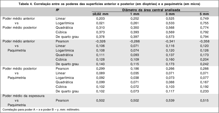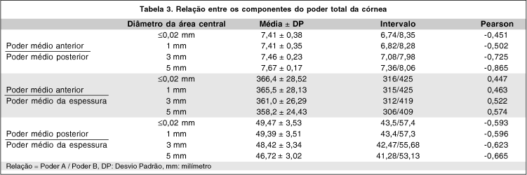OBJETIVO: Avaliar o poder dióptrico da porção central da córnea normal. MÉTODOS: Análise retrospectiva da topografia por varredura de fenda de luz e disco de Plácido em 30 olhos normais. RESULTADOS: Os poderes médios ceratométrico, anterior, da espessura e total; ópticos ceratométrico e total; axiais ceratométrico e total; tangencial total, equivalente e a soma do poder médio de ambas superfícies foram semelhantes (p>0,8361) nas quatro áreas centrais analisadas (0,04, 1, 3 e 5 mm de diâmetro). O poder médio posterior diminuiu de -6,62 D até -6,35 D (p=0,0030). A espessura média aumentou de 524 µm até 554 µm (p=0,0231), representando 0,13 D do poder total da córnea. Os poderes óptico (p<0,0167), axial (p<0,0099) e médio (p<0,0030) ceratométricos foram aproximadamente 1,50 D mais positivos que os respectivos poderes totais. O poder médio total foi igual ao poder equivalente (p>0,4907) e à soma do poder de ambas superfícies (p>0,3868). O poder médio anterior foi ao redor de 7,5 vezes maior que o poder médio posterior. CONCLUSÕES: O poder real da córnea calculado usando ambas superfícies, sua espessura e os índices de refração fisiológicos é menor que o poder convencionalmente aceito e determinado pela medição da curvatura da superfície anterior e o índice de refração ceratométrico da córnea (F