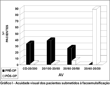 O seguimento variou entre 3 e 8 meses de período pós-operatório, com refração prescrita, em média, no 2º mês. A acuidade visual no período pós-operatório foi melhor que 20/40 em 89% dos olhos (Gráfico I). Os 11% restante apresentavam degeneração macular relacionado à idade (8 olhos), buraco macular (01) e retinopatia diabética (02). Nenhum olho evoluiu com ceratopatia bolhosa ou descolamento de retina no período de seguimento.