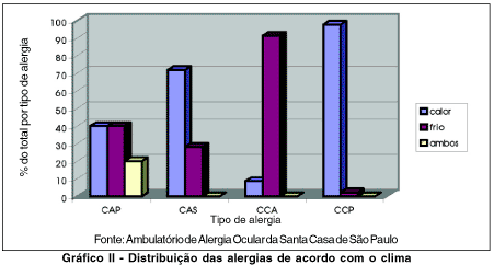 Na CCP as crises foram mais freqüentes no calor (n=92; 96,8%), e na CCA, no frio (n=32;91,4%). A CAS mostrou- se pouco mais freqüente no calor (n=23;71,9%) e a CAP 2 pacientes referiram ter sintomas o ano todo. A análise estatística mostrou p<0.001 para CAS, CCA e CCP. (Gráfico II)