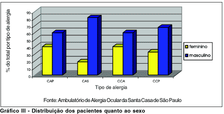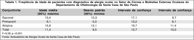 A idade dos pacientes estudados teve média geral baixa, de 11,4 anos, variando de 1 a 48 anos, o que se deve à baixa idade dos pacientes com CCP, cuja média foi a menor entre os 4 subtipos, 9,1 anos, de 1 a 23 anos, o que se deu por ser a CCP uma forma de alergia ocular que ocorre em crianças e se resolve espontaneamente na adolescência. Estes dados estão de acordo com aqueles encontrados por outros autores(3-4,6,12).