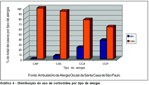 Quarenta por cento dos pacientes tratados com esteróides usaram acetato de prednisolona 1%; 35,% por cento, fosfato de dexametasona 0,1% e 24,5%, rimexolona, sempre em esquema de pulsoterapia. A freqüência do uso destas drogas foi uma vez ao ano em 57,1% das CCP, 50,0% das CCA e 100,0% das CAS. Pacientes com CCP chegaram a usar até 4 vezes ao ano, por até 60 dias seguidos, reforçando, assim, a idéia de que esta forma de alergia é muito severa(1,4,7,13).