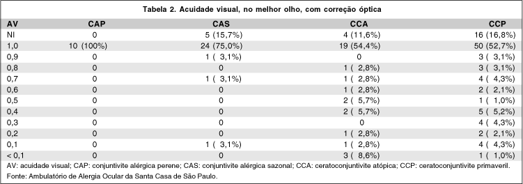 Como esperávamos, a CAP não causou diminuição visual, já que pode acometer a córnea; 75% dos pacientes com CAS obteve visão 1,0 com correção óptica, no melhor olho; a CCA e a CCP, devido às alterações corneais e possíveis seqüelas, como leucoma residual após úlcera em escudo e ceratocone, apresentaram menos pacientes com 1,0 de visão. Por outro lado, a CCA apresentou mais pacientes com visão menor ou igual a 0,5 em relação a CCP, provavelmente pelas alterações ocorridas a longo prazo, já que esta forma de alergia não tem cura(3).