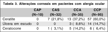 Ceratocone é uma ectasia corneal que pode aparecer em indivíduos com alergia. É descrita em pacientes com a forma atópica da doença, sua etiologia ainda não é bem estabelecida, mas pode haver um componente genético e o fato de o paciente coçar os olhos pode promover seu desenvolvimento(12). Pacientes com CCA, CCP e CAS, em 14,2%, 6,4% e 3,1% respectivamente, se apresentaram com a doença após o diagnóstico da alergia ocular.