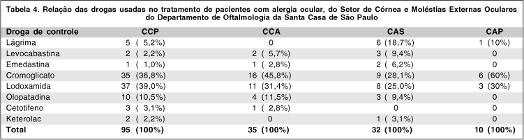 Entre os pacientes com CCP, 50,5% controlaram o quadro clínico com a primeira medicação usada (n=48). As drogas mais usadas no tratamento foram o cromoglicato dissódico 4%, usado em 35 dos 95 pacientes (36,8%) e a lodoxamida 0,1%, em 37 pacientes (39,0%), esta última controlou o quadro definitivamente para a maioria dos pacientes. (Tabela 4)