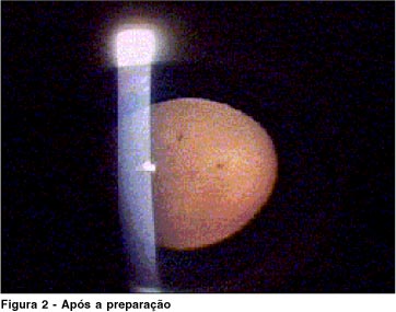 3. Paracentese da câmara anterior com agulha de calibre 25 X 6 mm (Becton & DicksonR) permitindo a saída de humor aquoso para a injeção de Dextran a 10% na câmara anterior com a mesma agulha. Em média foi injetado 0.5ml.