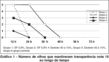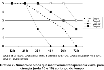 Quatro grupos foram estudados num total de 20 olhos. O tratamento da córnea com Dextran 40 a 10% promoveu a transparência corneana em 100% dos olhos (Fig. 1 e 2). A solução de SF a 0,9% e dextran em partes iguais (grupo 2) obteve 2 olhos (40%) totalmente transparentes às 36 h, e 3 olhos ainda viáveis para cirurgia (notas 10 e 15) às 72 h. No grupo de Dextran puro (grupo 3) às 48 h não havia olhos úteis para cirurgia. No grupo com SF a 0,9% (grupo 1) não havia olhos com nota 15 ao fim de 24 h. O grupo 3 não tinha mais olhos com nota 15 em 12 h, e às 48 h seus olhos já não eram mais viáveis. Os olhos em câmara úmidos (grupo controle, n. 4) tiveram um comportamento semelhante ao grupo 2 porém após 24 h não havia mais olhos com transparência nota 15 e às 72 h havia apenas 2 olhos com transparência útil para cirurgia (notas 10 e 15) (Gráficos 1 e 2).