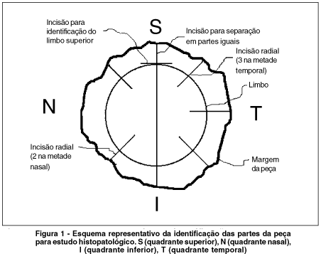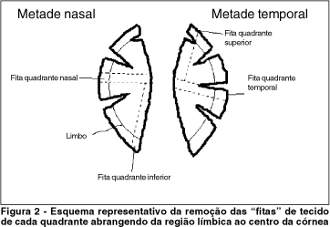 Quatro parâmetros morfológicos foram estudados: epitélio, resposta inflamatória, vascularização e resposta fibroblástica. O estudo desses parâmetros foi feito utilizando-se dois tipos de coloração, Hematoxilina-Eosina (HE) e Periodic Acid-Schiff (PAS). Foi feita análise descritiva dos cortes histológicos. As figuras 1 e 2 apresentam esquemas representativos da remoção da peça para exame histopatológico e da remoção das fitas de cada quadrante, respectivamente.