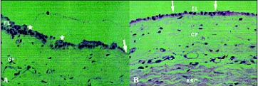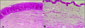 No epitélio corneano, composto, em média, por quatro a cinco camadas celulares, percebeu-se claramente a regularidade de sua espessura. Tratava-se de epitélio pavimentoso não queratinizado, cujas células variaram de morfologia nas três camadas: camada basal, de células mais "alongadas"; camada média de células poliédricas, e camada superficial, de células achatadas (Fig. 3A).