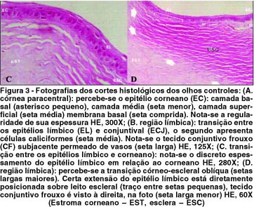 Na região límbica, percebeu-se aumento da espessura do epitélio, que passou a apresentar, em média, 6 a 7 camadas de células. As células epiteliais do limbo não apresentaram, em suas camadas, uma mudança de morfologia tão evidente quanto às células do epitélio corneano, caracterizando um padrão intermediário entre o epitélio conjuntival e o epitélio corneano. Não se observaram células caliciformes. A transição desses epitélios foi facilmente percebida pela mudança de características da disposição das células de cada epitélio (Fig. 3C).