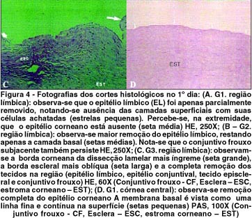 O epitélio corneano estava ausente nas três técnicas. A membrana basal foi vista no PAS como uma fina linha contínua (Fig. 4D). O epitélio límbico foi apenas parcialmente removido na T1, notando-se ausência das camadas superficiais, com suas células achatadas em todos os quadrantes corneanos (Fig. 4A). Na T2, o epitélio límbico foi mais amplamente removido. Em alguns quadrantes corneanos esse epitélio foi totalmente removido, sendo que, em outros, houve persistência da camada basal, apenas (Fig. 4B). Não houve um quadrante específico onde as células basais do epitélio límbico mais persistiram. Na T3, a localização límbica da dissecção lamelar foi claramente percebida em todos os cortes histológicos. Nas bordas da região removida, observou-se uma margem anterior no estroma corneano íngreme e uma margem posterior, mais oblíqua. A profundidade de tecido removido foi semelhante nas secções observadas, alcançando entre um terço e meia espessura da córnea e esclera (Fig. 4C).