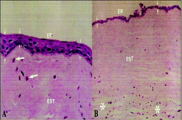 O epitélio regenerativo, agora, já recobriu toda a superfície corneana, também na T2, sendo, em T3 variável, e passou a apresentar características de padrão conjuntival (Fig. 6A,B,).