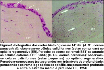 As diferenças de velocidade de reepitelização entre os grupos foram claramente percebidas nos cortes histológicos do 14º dia. O epitélio regenerativo passou a apresentar gradualmente um padrão de epitélio conjuntival, assim como mencionado por outros autores(5-6). A partir do 14º dia, foram percebidas células caliciformes, que atingiram uma densidade máxima no 28º dia, o que foi compatível com outros estudos(5-6). As células do epitélio regenerativo apresentaram um formato poliédrico com grande variação de tamanho entre células vizinhas. A espessura do epitélio regenerativo foi irregular. Não ocorreu a variação da morfologia celular entre as camadas, característica do epitélio corneano normal. Outros autores(13) também referiram grande variação de tamanho e morfologia das células regenerativas em caso de deficiência das CG.